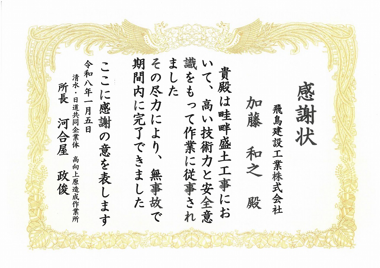 清水建設株式会社様より、畦畔盛土工事において表彰をいただきました。